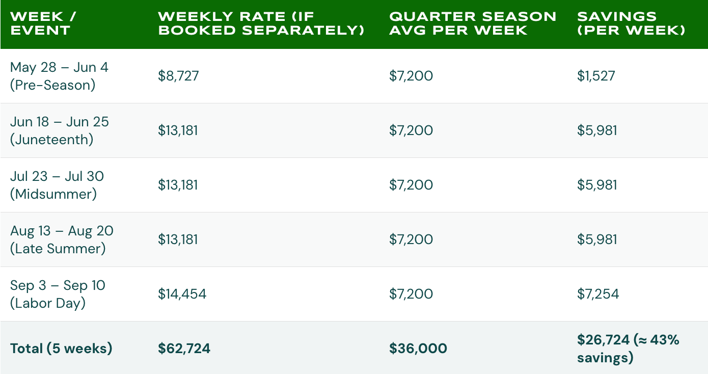 And because it’s booked as one package, the weekly cost is often significantly lower than renting those same weeks individually. Off-season is the perfect time to plan, set before the summer begins.